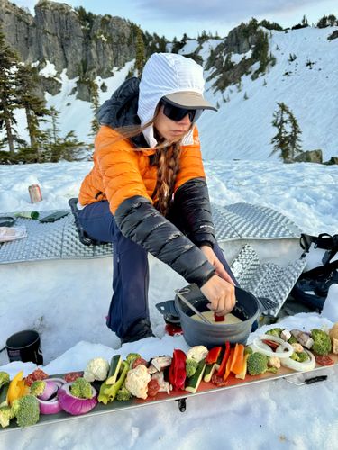 This is not the exact pot I use but it is the most similar. The one I have is by Sea to Summit. The qualities I love about this are the silicone sides, metal bottom and straining lid. I place this directly on my MSR pocket rocket to cook soup or the famed backcountry fondue. Collapses to fit easily in the pack.